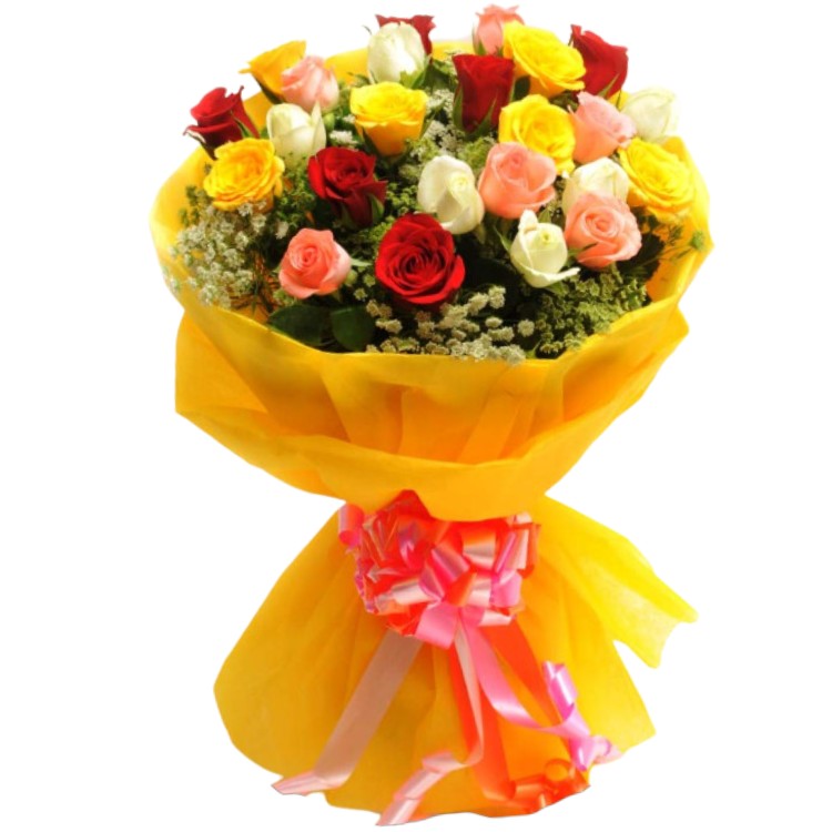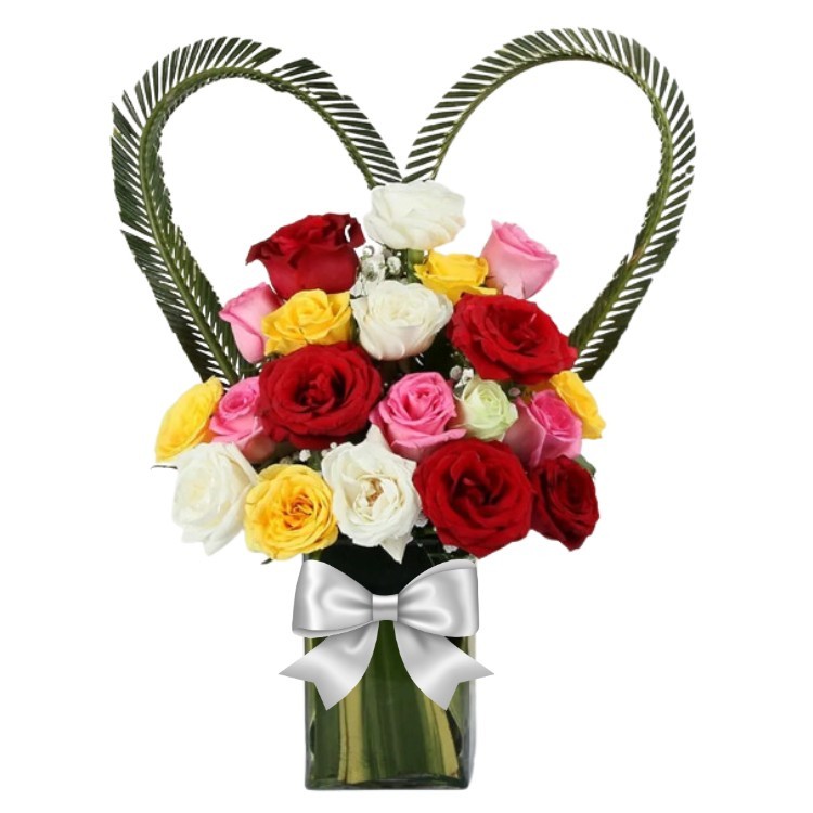 A Cute Heart Shape Arrangement of 21 Mix Color Roses in Glass Vase