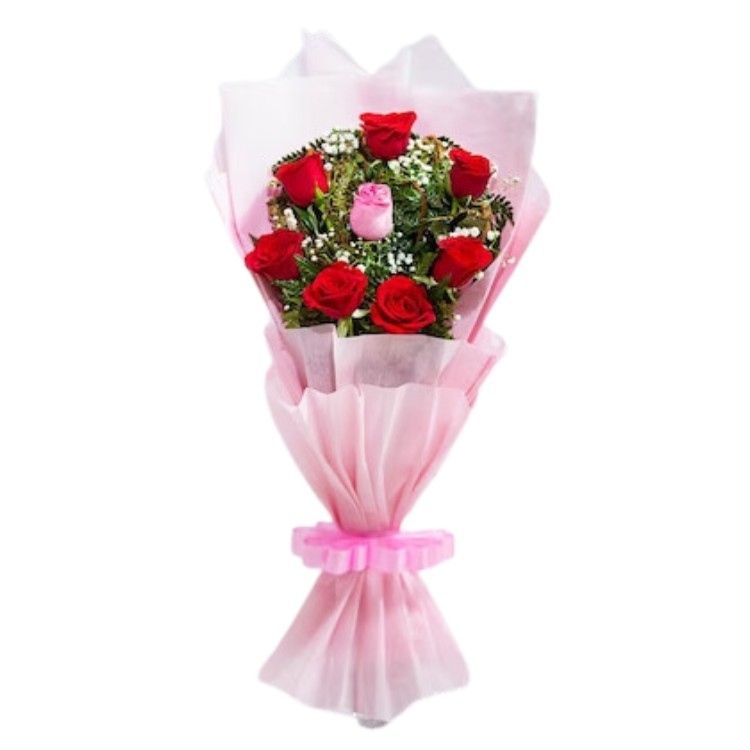 1 Pink & 7 Red Roses Bunch Wrapped in Pink Paper
