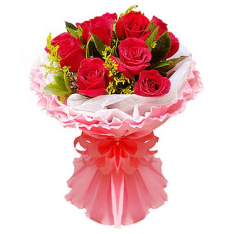10 Red Roses Fancy Bunch Wrapped in Pink & White Paper