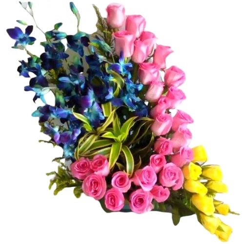 A Designer Basket Arrangement of 25 Pink, 8 Yellow Roses & 5 Blue Orchids