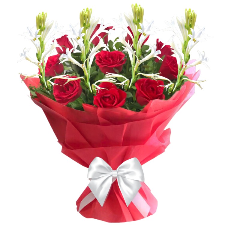 # A Beautiful Bunch of 5 Fragrant Rajnigandhas & 10 Red Roses