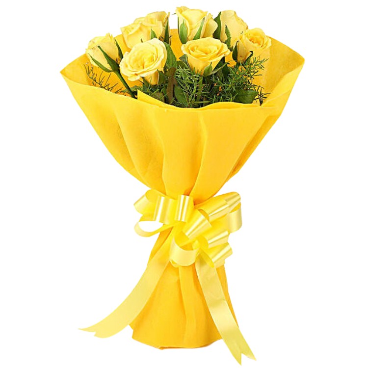 8 Yellow Roses Bunch Wrapped in Yellow Paper