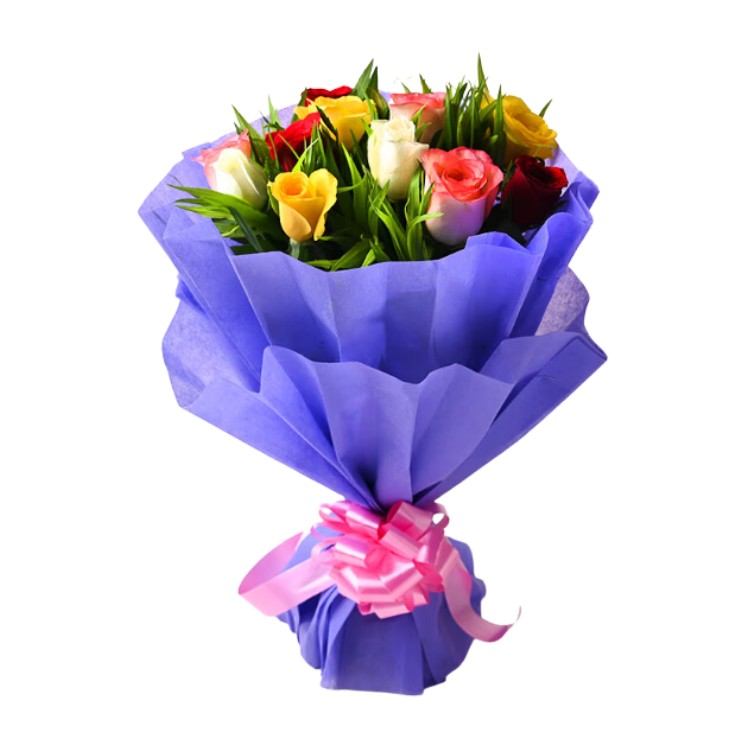 8 Mix Color Roses Bunch Wrapped in Blue Paper