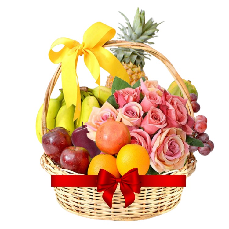 A Fresh Fruits Combo – A Fresh Fruits Basket + 12 Pink Roses
