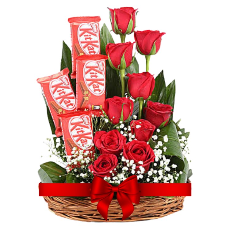 # 01 – A Cute Basket of 4 KitKat Chocolates & 10 Red Roses