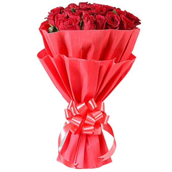 A Beautiful Bunch of 21 Red Color Roses Wrapped in Red & White Paper, Tied With a Bow.