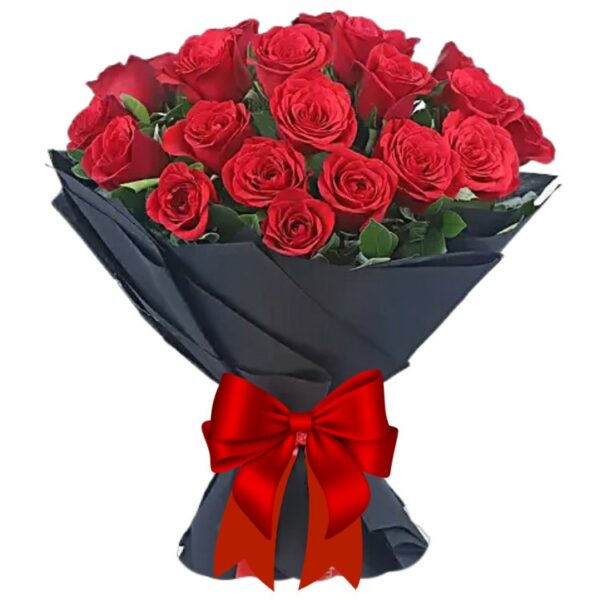 A Beautiful Royal Bunch of 27 Red Color Roses Wrapped in Black Paper, Tied With a Bow.