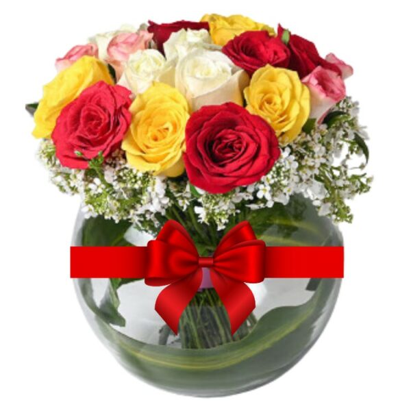 • A Beautiful Premium Arrangement of 21 Mix Color Roses in a Re-Usable Round Bowl Shaped Glass Vase, Tied With a Bow.