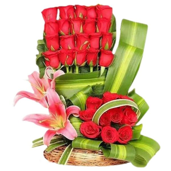 A Beautiful Designer Basket Arrangement of 30 Red Roses & 2 Pink Lilies, With Exotic Leaves, Tied With a Bow.