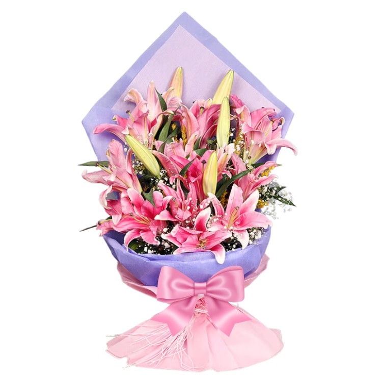 A Charming Premium Bouquet of 7 Pink Lilies, Wrapped in Pink & Blue Paper, Tied With a Bow.